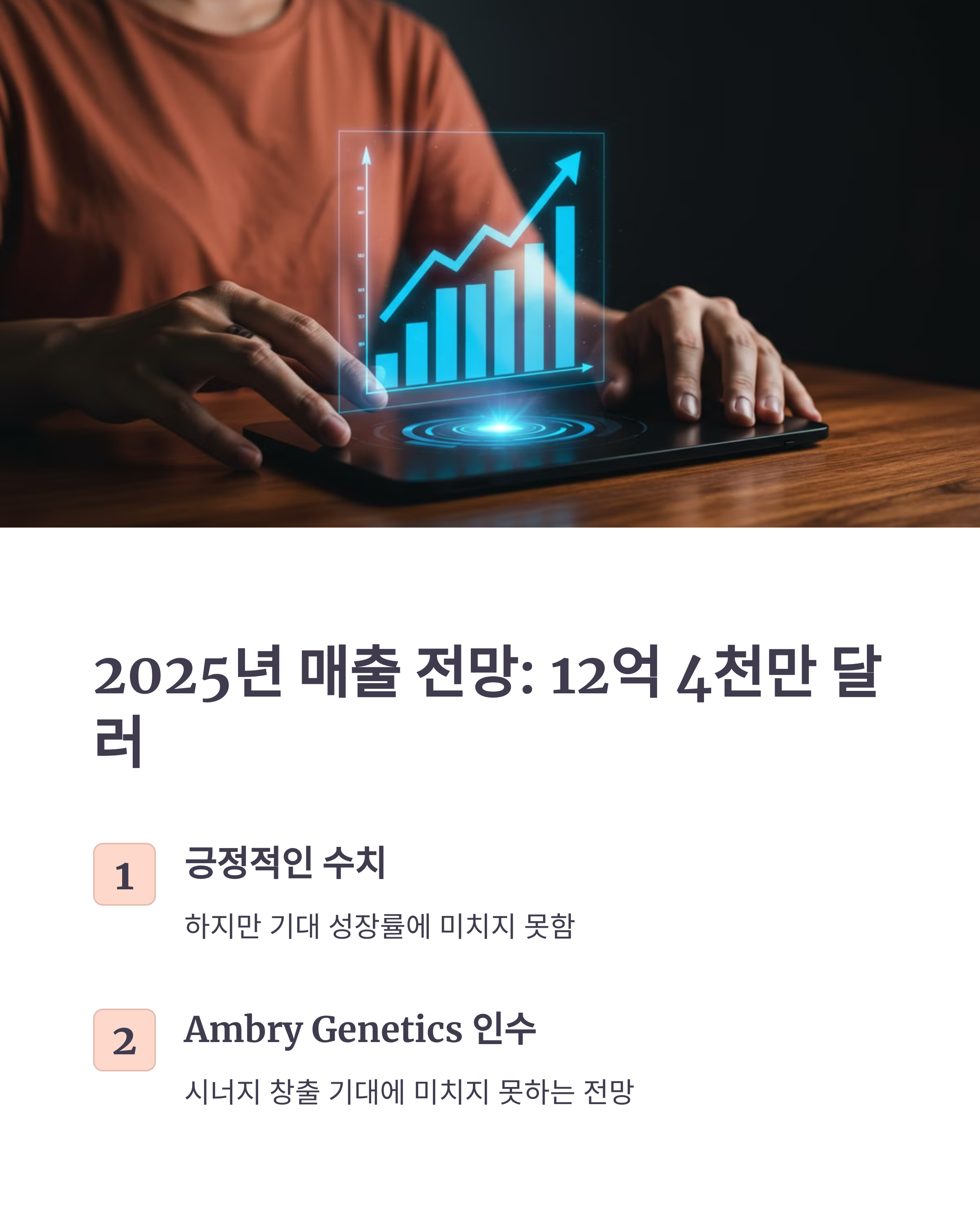 - 2025년 매출 전망: Tempus AI는 2025년 전체 매출을 12억 4천만 달러로 예상한다고 발표했습니다. 이 수치 자체는 긍정적일 수 있지만, 투자자들이 기대했던 성장률에 미치지 못했을 가능성도 있습니다. 특히 Ambry Genetics 인수를 통해 시너지를 창출하고 더 큰 성장을 이룰 것이라는 기대감이 있었기에, 이에 미치지 못하는 전망은 주가 하락의 원인이 될 수 있습니다.