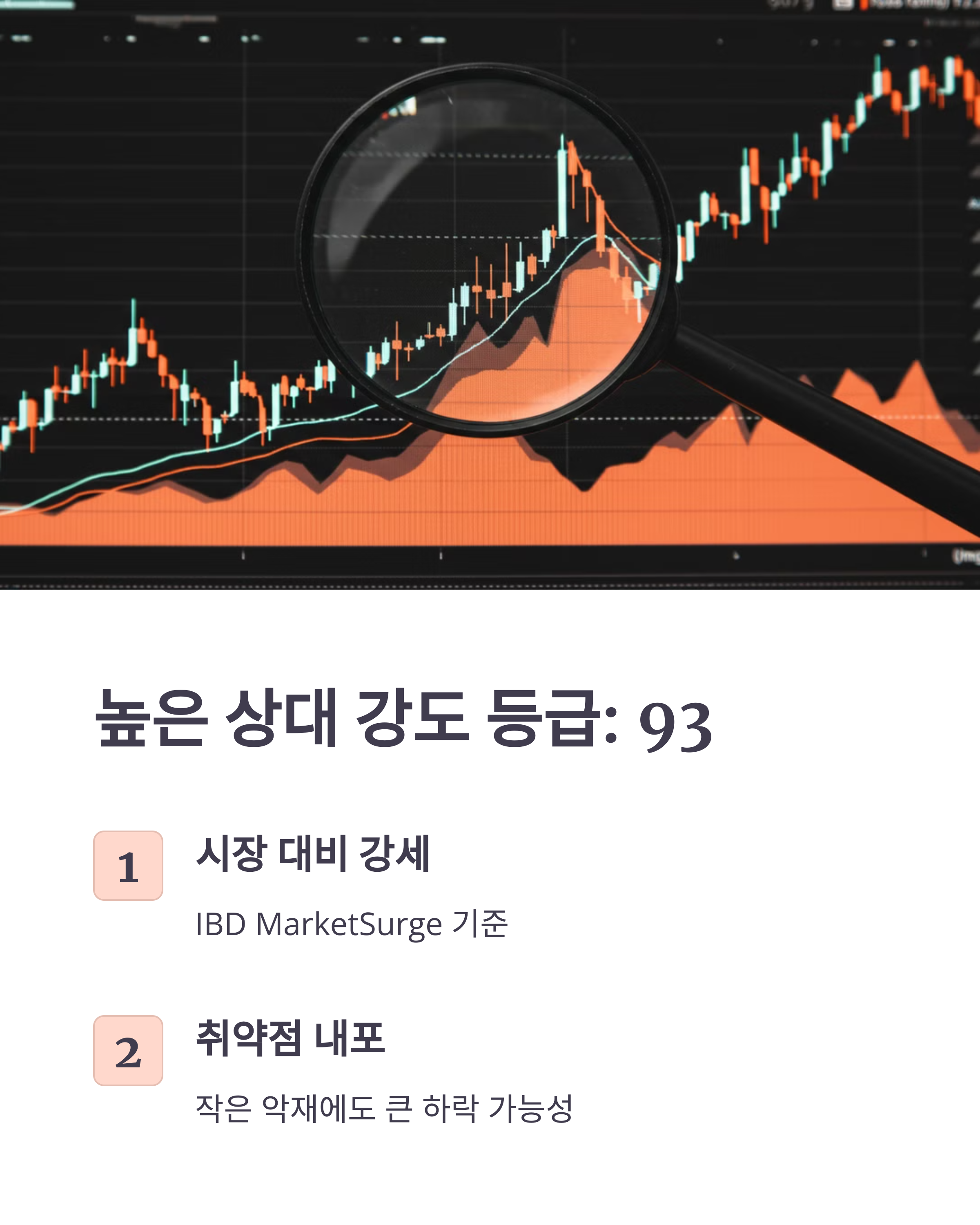 - 주식의 높은 상대 강도 (Relative Strength Rating): IBD MarketSurge에 따르면 Tempus AI의 상대 강도 등급은 93입니다. 이는 주가가 시장 전반보다 강세를 보이고 있다는 의미이지만, 한편으로는 이미 주가가 많이 상승한 상태이므로 작은 악재에도 크게 하락할 수 있다는 취약점을 내포합니다. 높은 기대감으로 주가가 상승한 상태에서 실적 발표가 기대에 미치지 못하자, 차익 실현 매물이 쏟아지면서 주가가 급락했을 가능성도 있습니다.