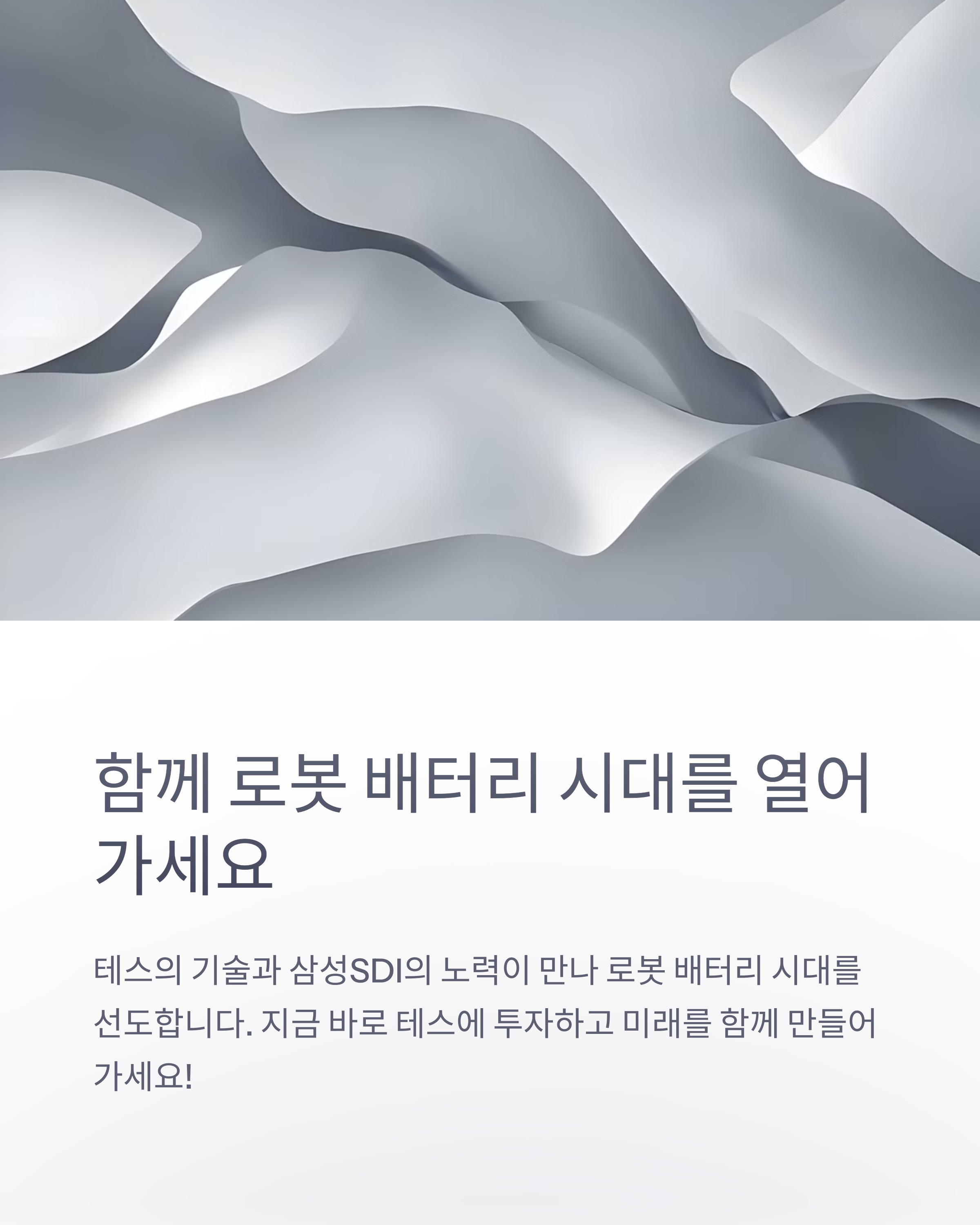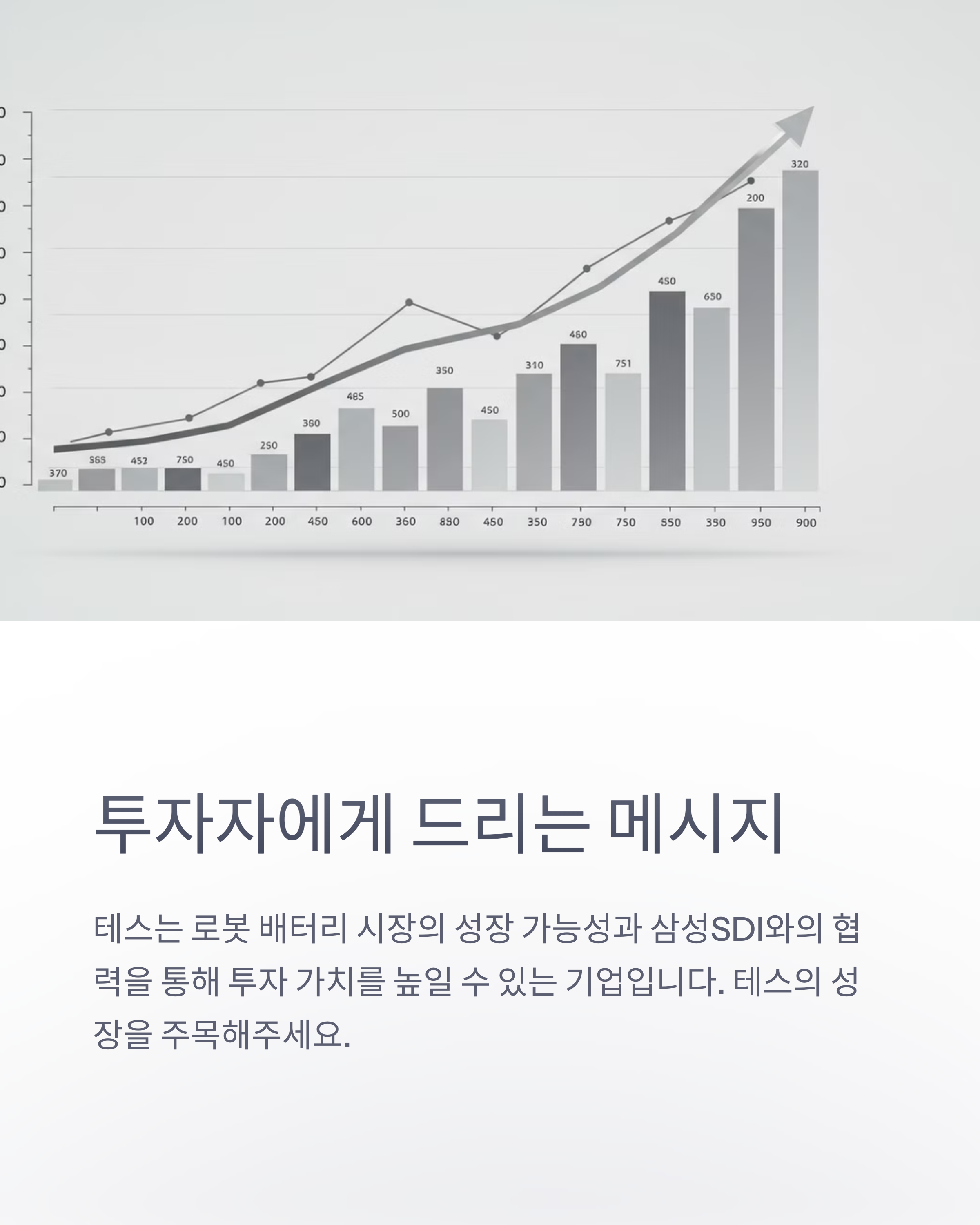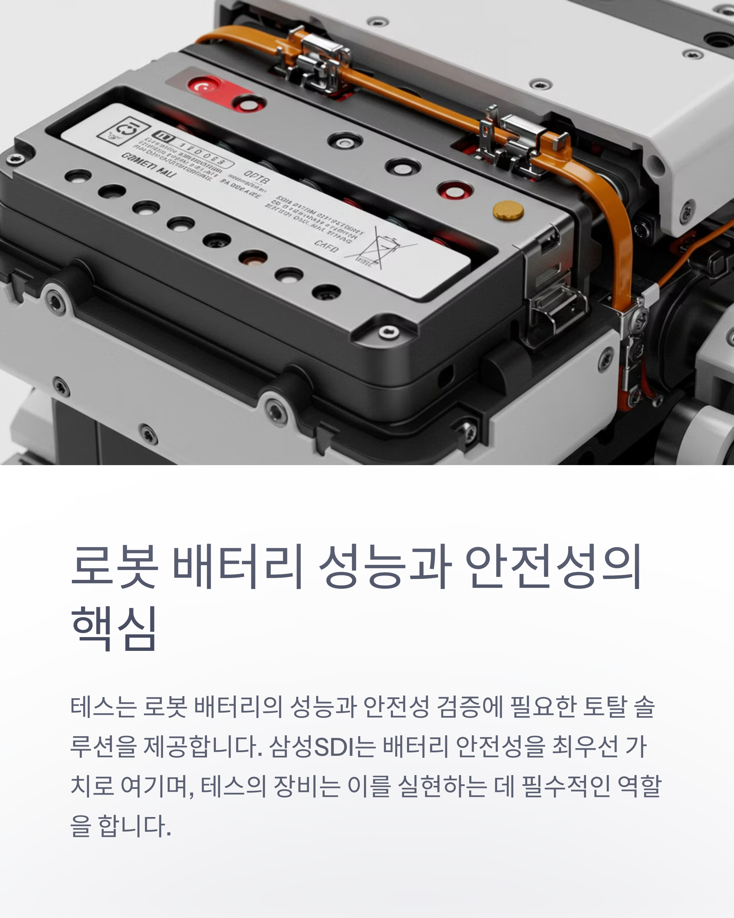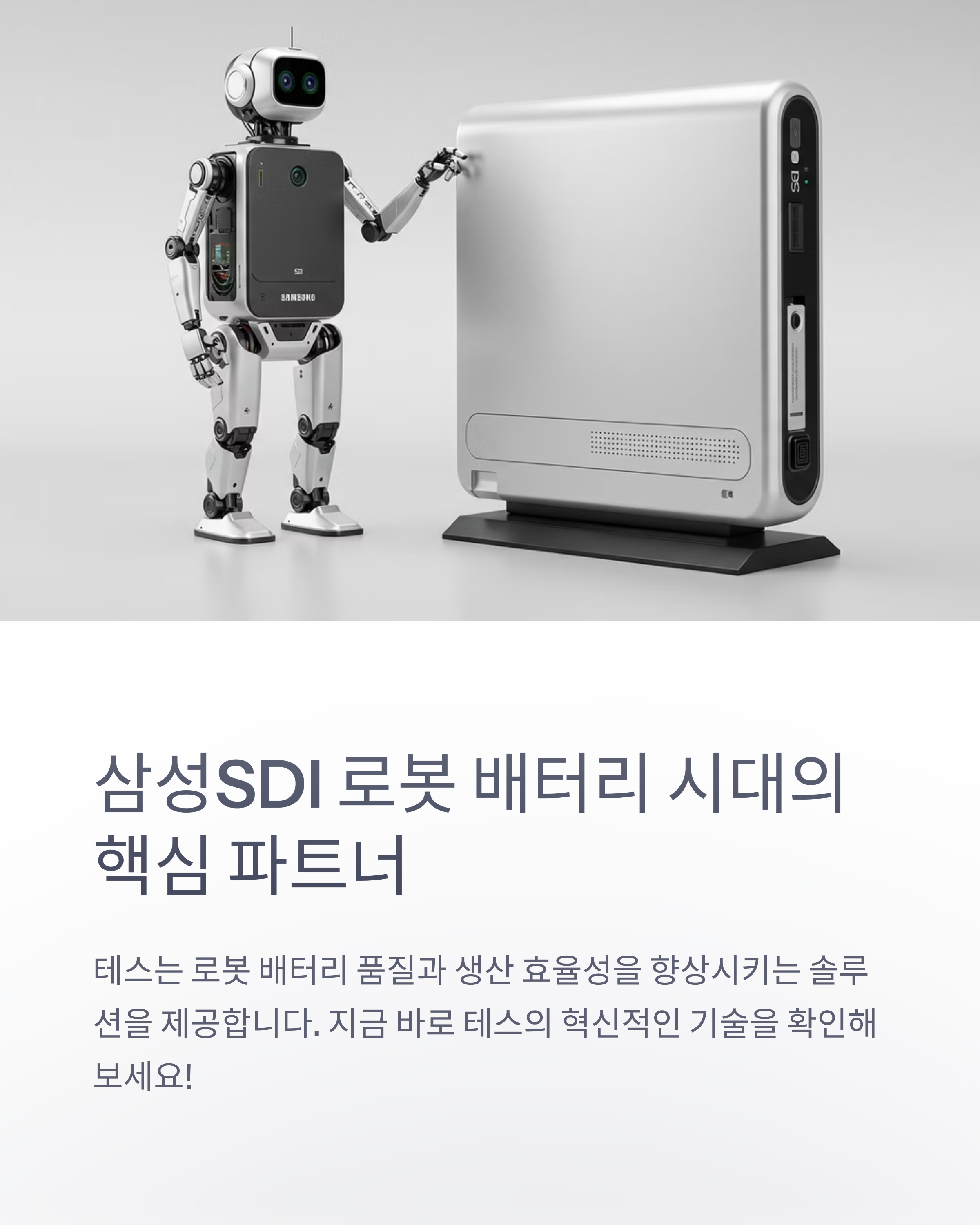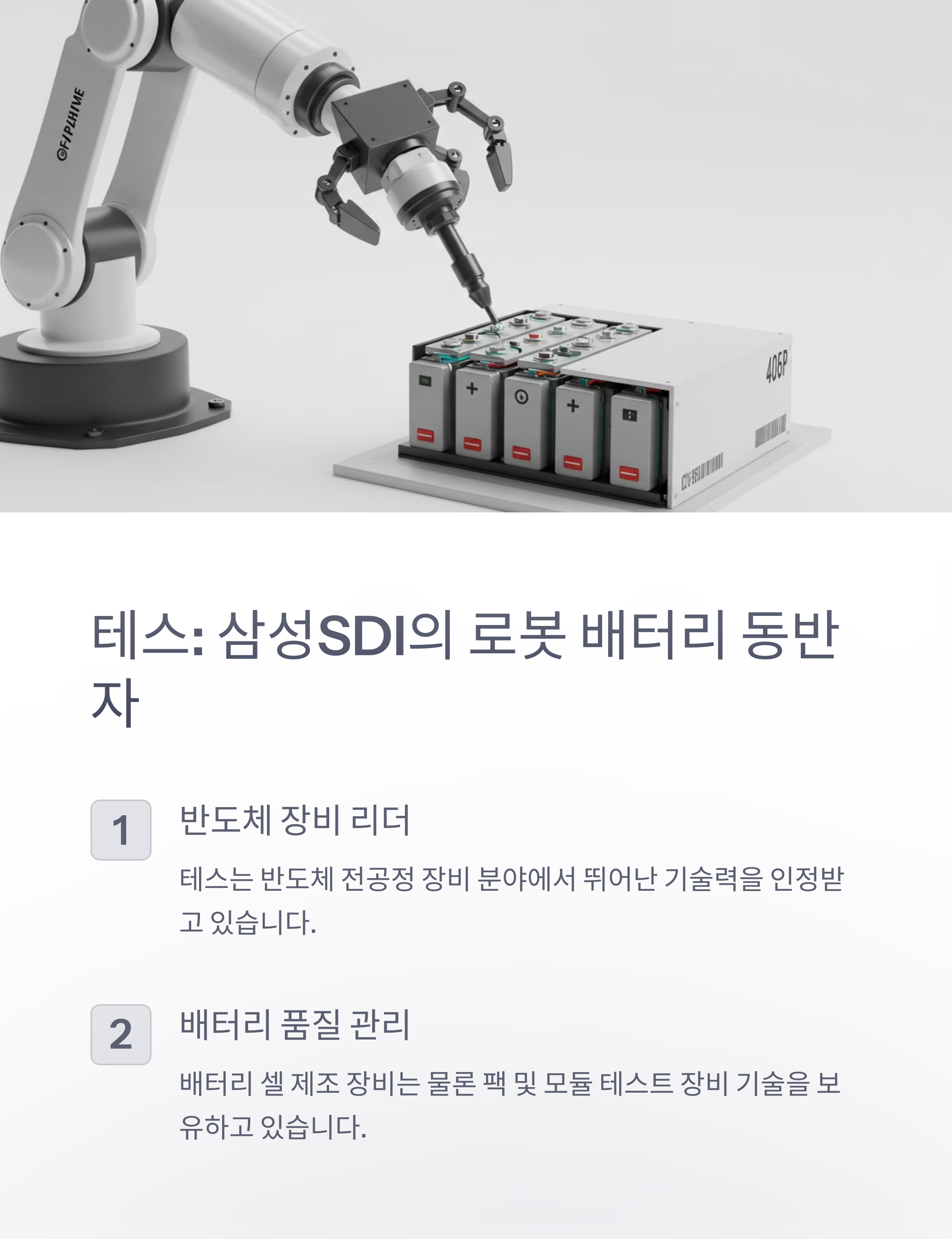 - 테스 (095270.KS): 테스는 반도체 제조 장비 전문 기업으로, 특히 전공정 장비 분야에서 높은 기술력을 인정받고 있습니다. 최근에는 사업 영역을 확장하여 배터리 장비, 로봇 자동화 장비 시장에도 진출하고 있습니다. 테스는 배터리 셀 제조 장비뿐 아니라, 배터리 팩 및 모듈 테스트 장비 기술을 확보하고 있으며, 로봇 배터리의 성능 및 안전성 검증에 필요한 토탈 솔루션을 제공할 수 있습니다. 삼성SDI는 배터리 안전성을 최우선 가치로 여기고 있으며, 테스의 배터리 테스트 장비는 삼성SDI의 로봇 배터리 품질 관리에 핵심적인 역할을 할 수 있습니다. 또한, 테스는 로봇 자동화 장비 기술을 바탕으로 로봇 제조 공정 자동화 솔루션도 제공할 수 있어, 로봇 생산 효율성 향상에 기여할 수 있습니다.