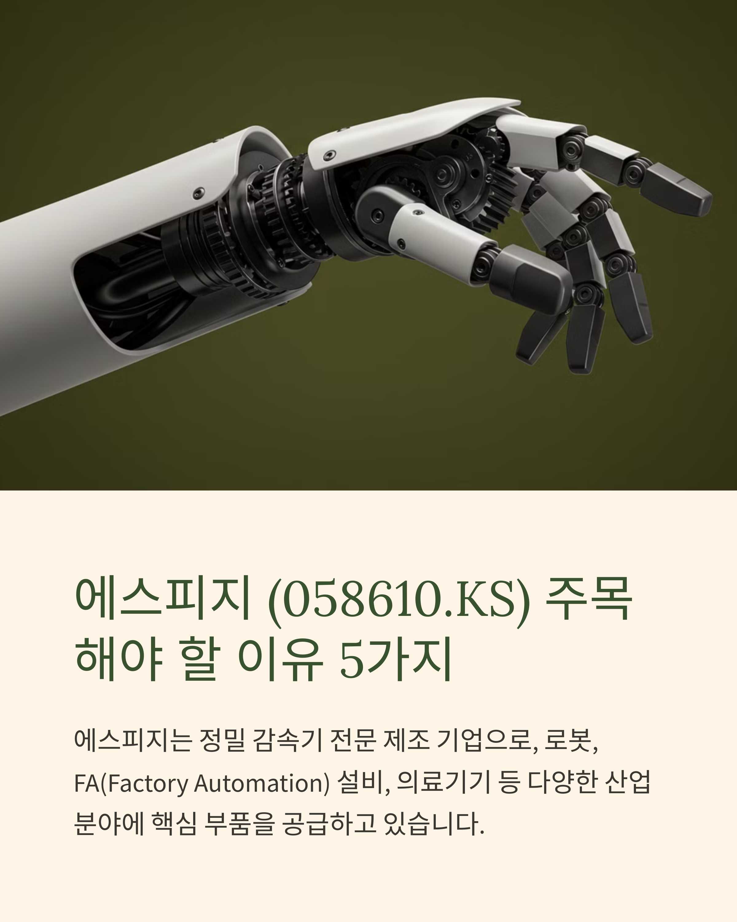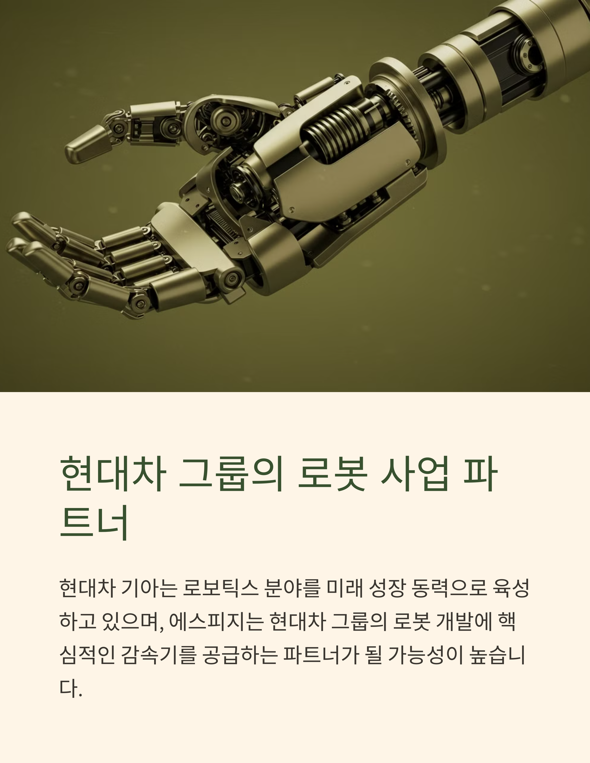 - 에스피지 (058610.KS): 에스피지는 정밀 감속기 전문 제조 기업으로, 로봇, FA(Factory Automation) 설비, 의료기기 등 다양한 산업 분야에 핵심 부품을 공급하고 있습니다. 로봇의 관절 역할을 하는 감속기는 로봇 성능에 매우 중요한 부품이며, 특히 협동 로봇, 서비스 로봇 시장 성장에 따라 고정밀, 소형 감속기 수요가 증가할 것으로 예상됩니다. 에스피지는 사이클로이드 감속기, 하모닉 감속기 등 다양한 종류의 감속기 라인업을 구축하고 있으며, 국내 시장 점유율 1위 기업입니다. 현대차 기아는 로보틱스 분야를 미래 성장 동력으로 육성하고 있으며, 에스피지는 현대차 그룹의 로봇 개발에 핵심적인 감속기를 공급하는 파트너가 될 가능성이 높습니다. 최근 에스피지는 로봇 감속기 외에도 로봇 액추에이터, 센서 등 로봇 핵심 부품 사업을 확대하며 종합 로봇 부품 기업으로 도약을 준비하고 있습니다.