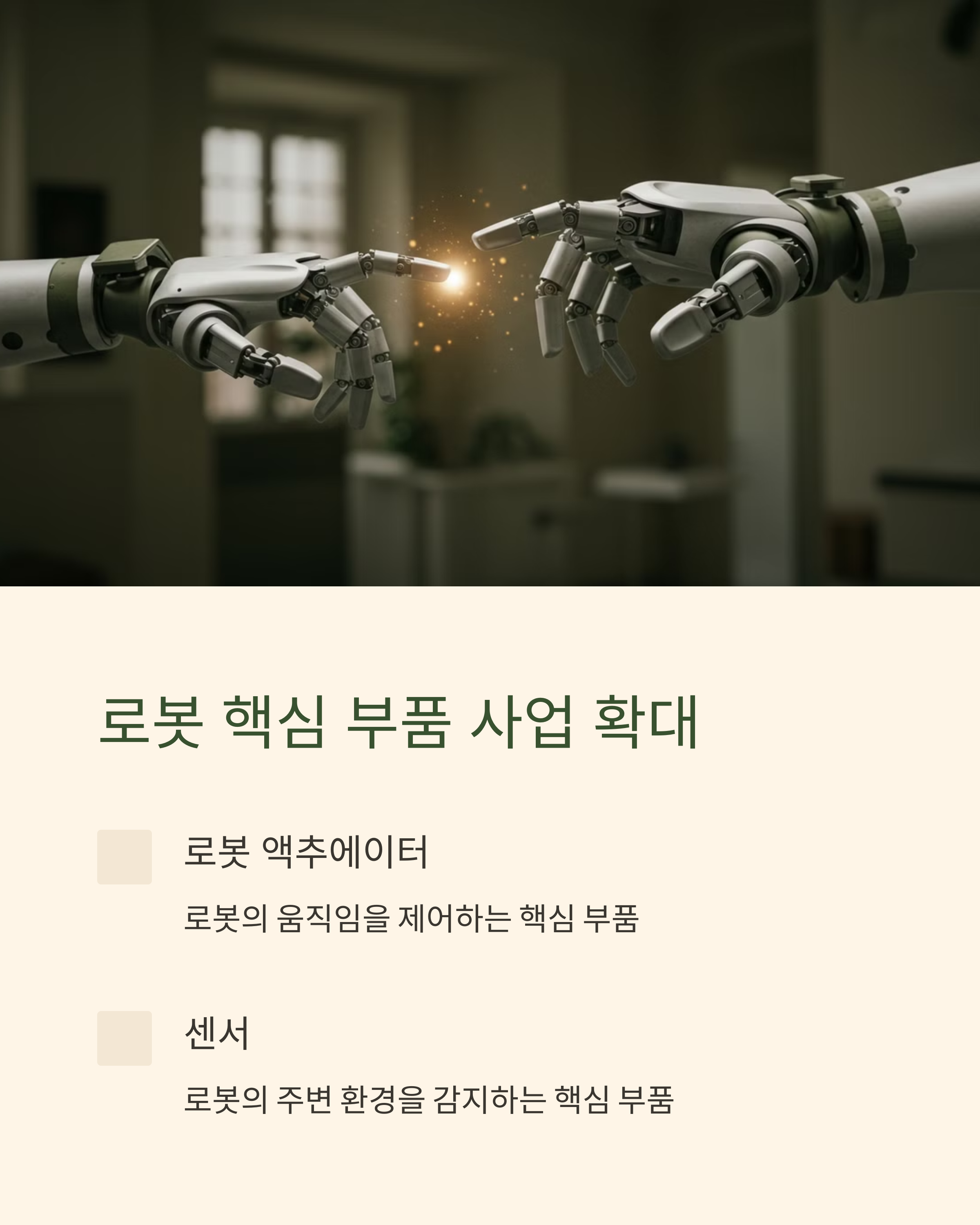 - 로봇 구동 부품: 로봇의 움직임에 필수적인 감속기, 액추에이터, 센서 등을 제조하는 기업은 로봇 시장 확대의 직접적인 수혜를 받을 수 있습니다. 특히, 현대차 기아의 로봇 개발 방향에 맞는 부품 기술을 가진 기업이 유리할 수 있습니다.