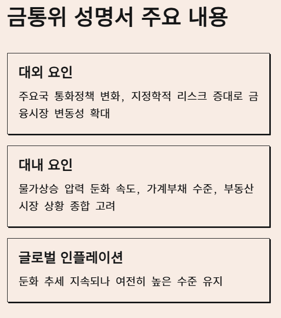 금통위는 성명서를 통해 대외적으로는 주요국의 통화 정책 변화, 지정학적 리스크 증대 등이 금융 시장의 변동성을 키우고 있으며, 대내적으로는 물가 상승 압력 둔화 속도, 가계 부채 수준, 부동산 시장 상황 등 다양한 요인들을 종합적으로 고려했다고 밝혔습니다. 특히, 글로벌 인플레이션 둔화 추세가 이어지고 있지만, 여전히 높은 수준을 유지하고 있고, 각국의 통화 정책 방향 또한 엇갈리는 모습을 보이면서 한국 경제의 앞날에 대한 불확실성을 키우고 있다는 점을 강조했습니다.