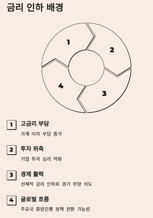 이러한 한국은행의 입장 변화는 최근 국내 경제의 어려움을 반영하는 것으로 보입니다. 고금리 장기화로 인해 가계의 이자 부담이 커지고, 기업의 투자 심리가 위축되는 등 실물 경제 전반에 걸쳐 부담이 가중되고 있다는 판단 하에 선제적인 금리 인하를 통해 경제 활력을 되살리려는 의도로 해석될 수 있습니다. 또한, 미국의 금리 인상 사이클 종료가 임박했다는 전망과 더불어, 주요국 중앙은행들의 통화 정책 전환 가능성이 제기되는 상황에서 한국은행 역시 발맞춰 통화 정책 방향을 선회하려는 움직임으로 풀이됩니다.