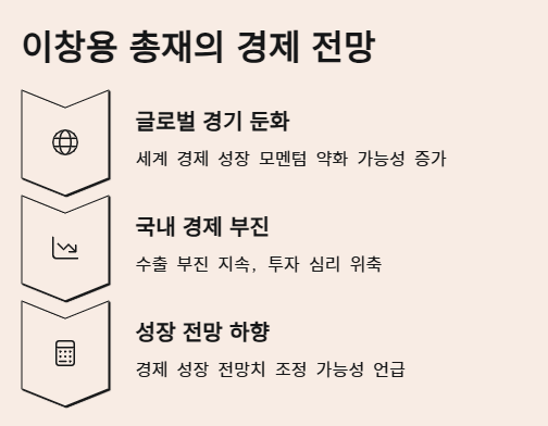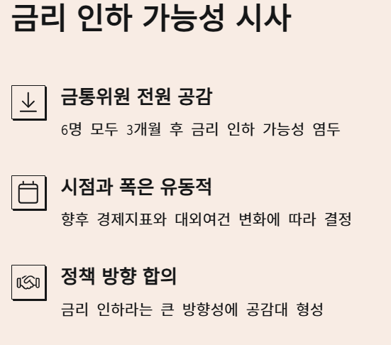 특히 시장의 관심이 집중되었던 향후 금리 인하 가능성에 대해 이창용 총재는 분명한 메시지를 전달했습니다. 그는 금통위원 6명 모두가 3개월 후의 금리 전망과 관련하여 기준금리 인하 가능성을 염두에 두고 있다고 언급했습니다. 이는 조만간 한국은행이 금리 인하 카드를 꺼낼 수 있음을 시사하는 중요한 발언으로 해석될 수 있습니다. 물론 금리 인하 시점과 폭은 향후 발표되는 경제 지표들과 대외 경제 여건 변화에 따라 결정될 것이라는 단서를 달았지만, 금리 인하라는 정책 방향 자체는 이미 금통위원들 사이에서 공감대가 형성되어 있음을 간접적으로 드러냈습니다.