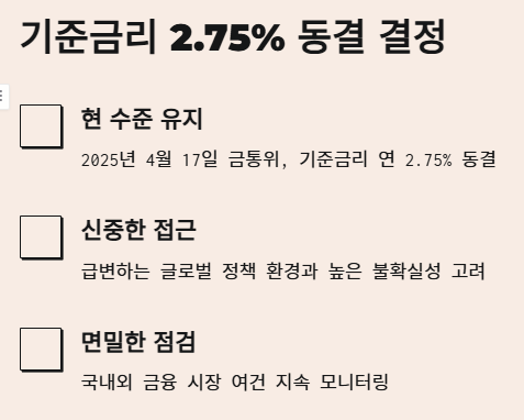 오늘(2025년 4월 17일) 한국은행 금융통화위원회(금통위)는 기준금리를 현재 수준인 연 2.75%로 유지하기로 결정했습니다. 이번 금리 동결 결정은 최근 급변하는 글로벌 정책 환경과 높은 불확실성 속에서 국내외 금융 시장의 여건을 면밀히 점검하고, 향후 정책 방향을 신중하게 모색하기 위한 한국은행의 고심이 담긴 결과로 풀이됩니다.