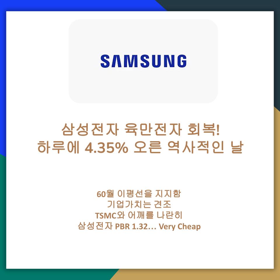 삼성전자는 반도체, 가전, 스마트폰 등의 사업을 영위한다. 그리고 각각의 분야에서 세계 최고의 자리에 있다. 그런데, PBR은 1.32다. 애플은 36.84다. 삼성전자가 애플보다 더 많은 스마트폰을 팔고 있음에도 PBR은 30분의 1도 안된다. 삼성전자는 저평가 되어 있다. 그런데, 극도로 많이 빠졌다. 환율은 지금 현재 최악이다. 그래서 반등할 것으로 예상된다. 물론 10월 다시 조정장이 찾아올 수도 있으나, 삼성전자 주가에 대한 공부가 필요하다.