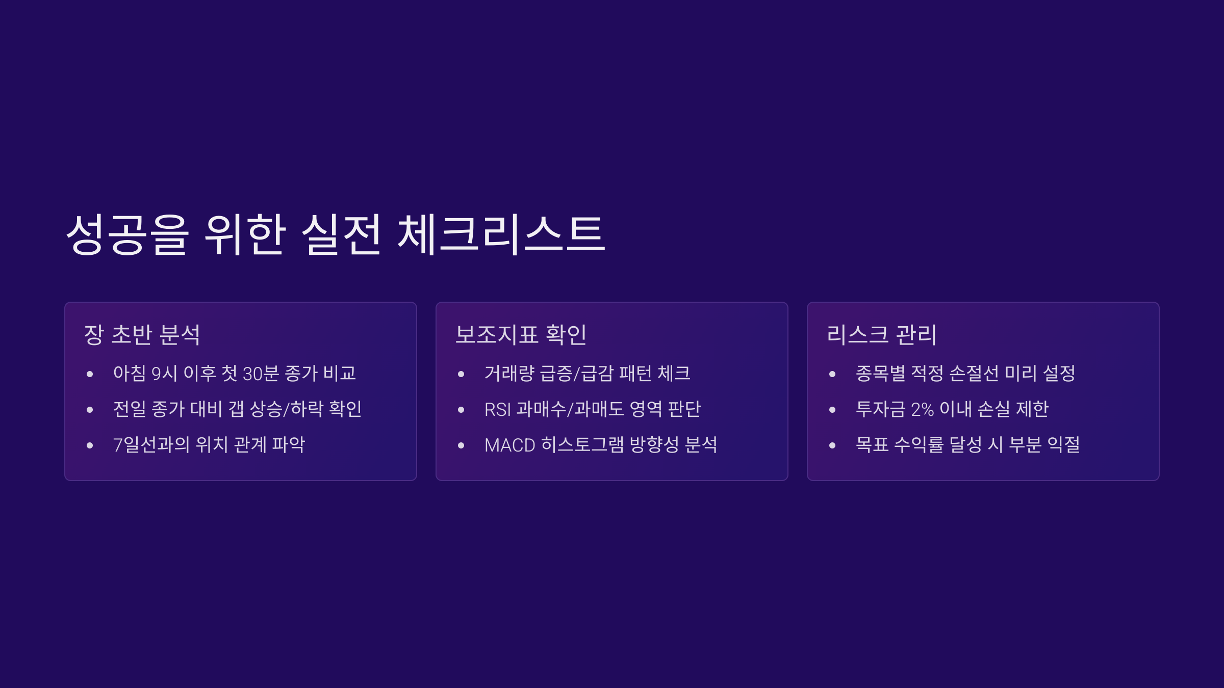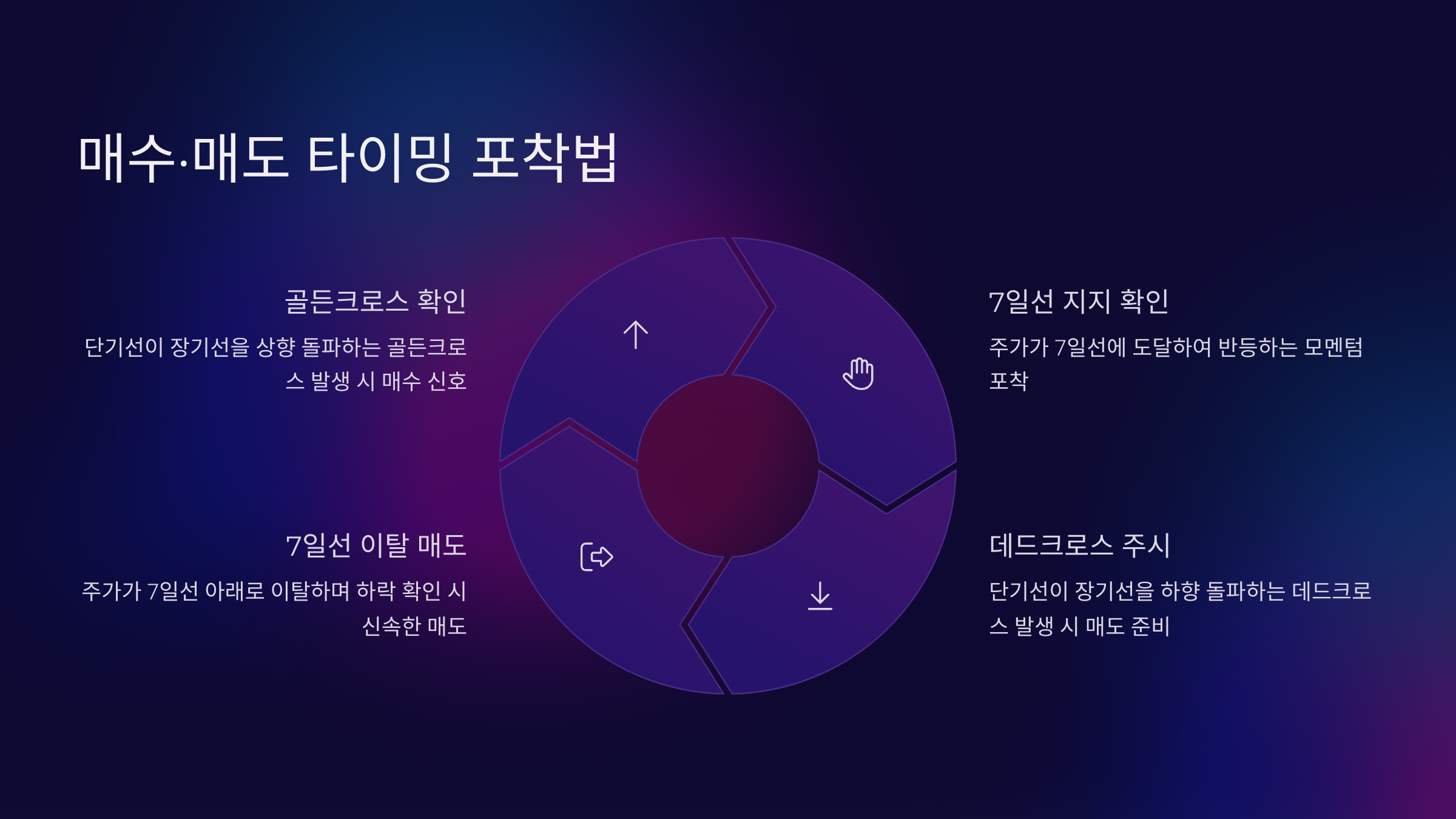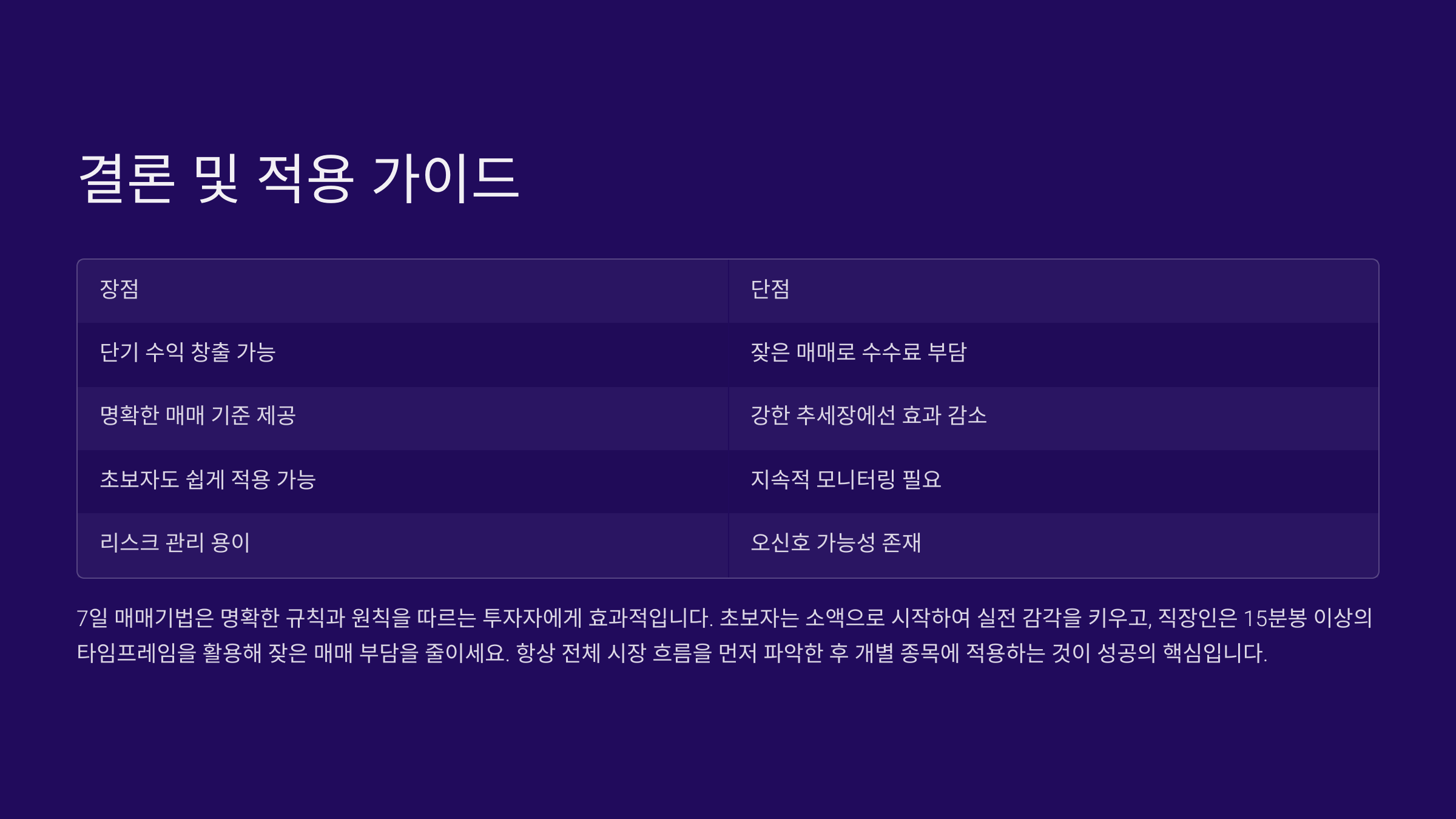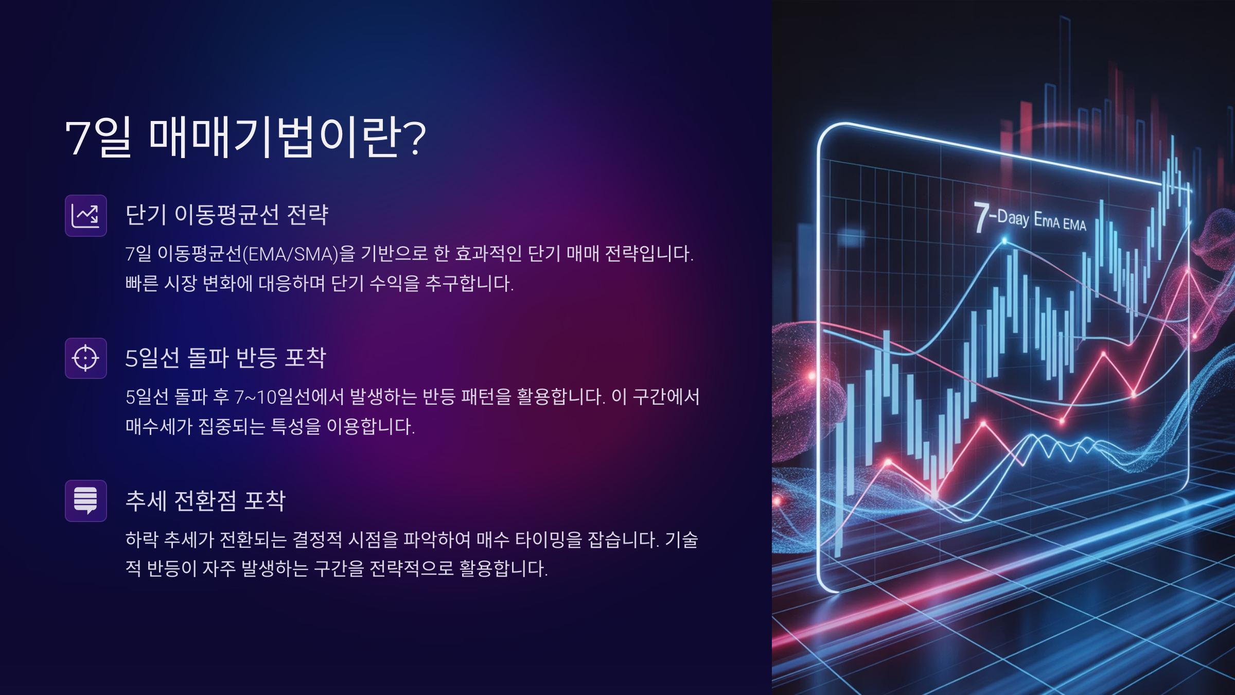 - 7일선 지지 시 매수, 이탈 시 매도 신호