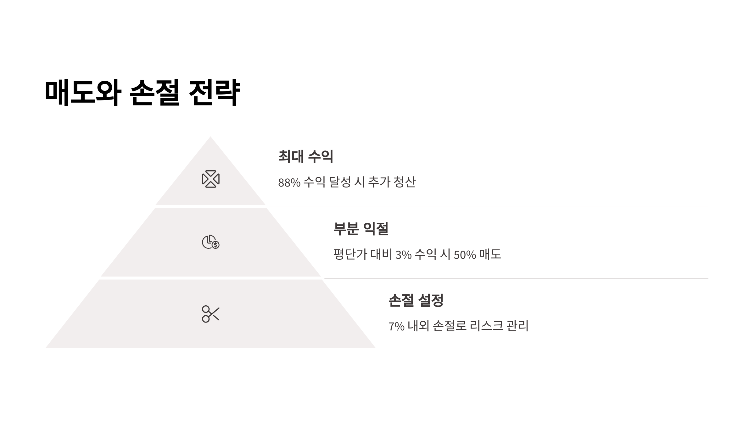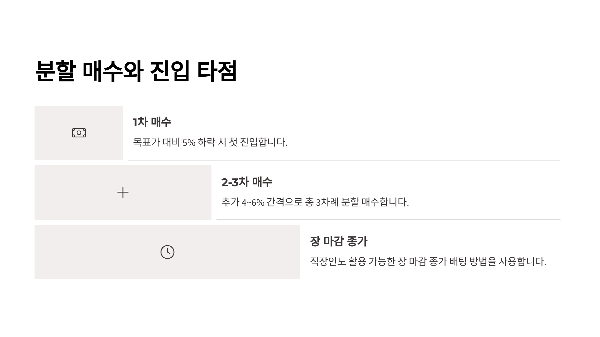 - 2차, 3차 매수: 추가 4~6% 간격, 총 3차례 분할 매수