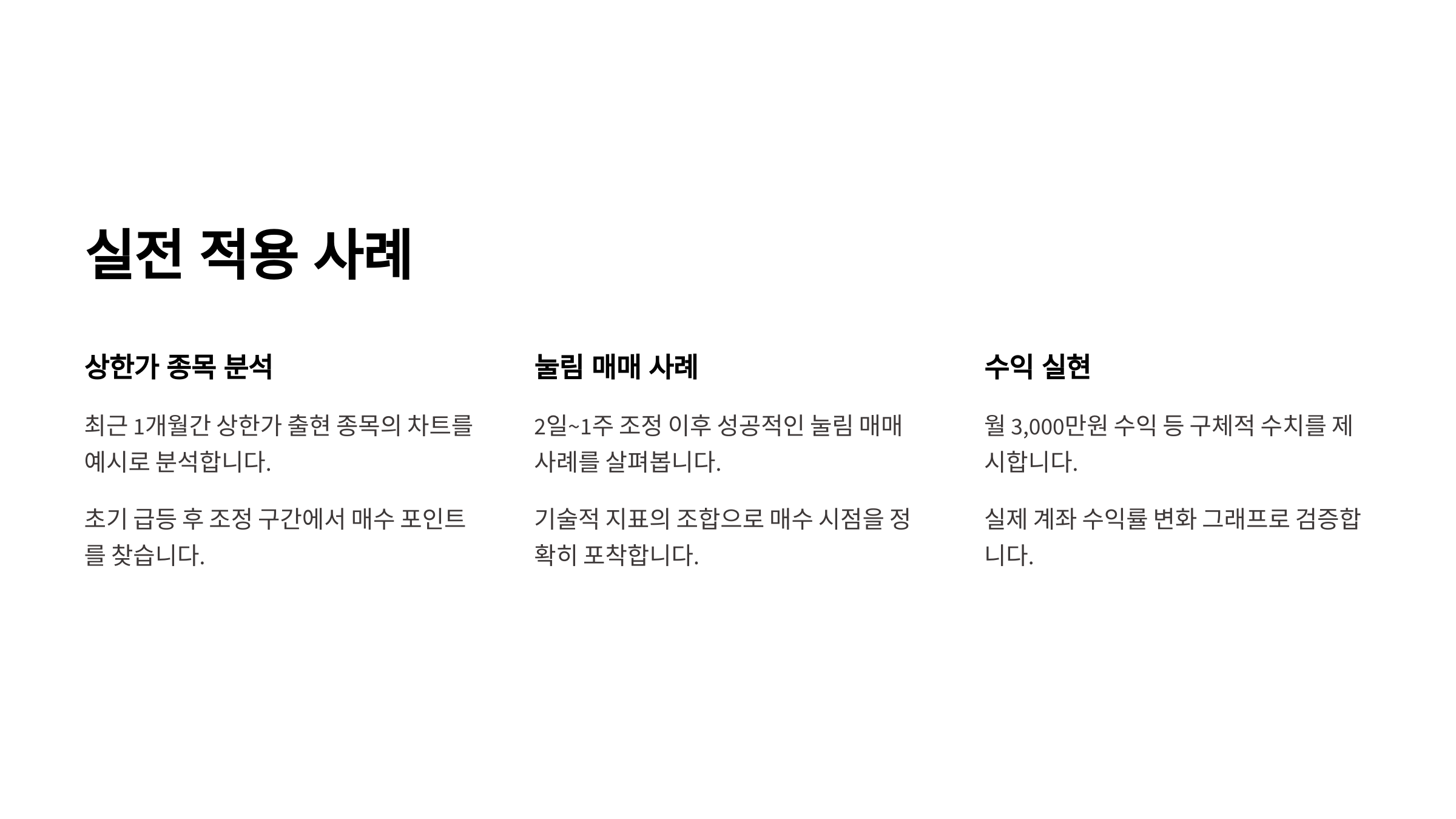 - 일봉·주봉 차트 활용: 거래량, 이동평균선 중심