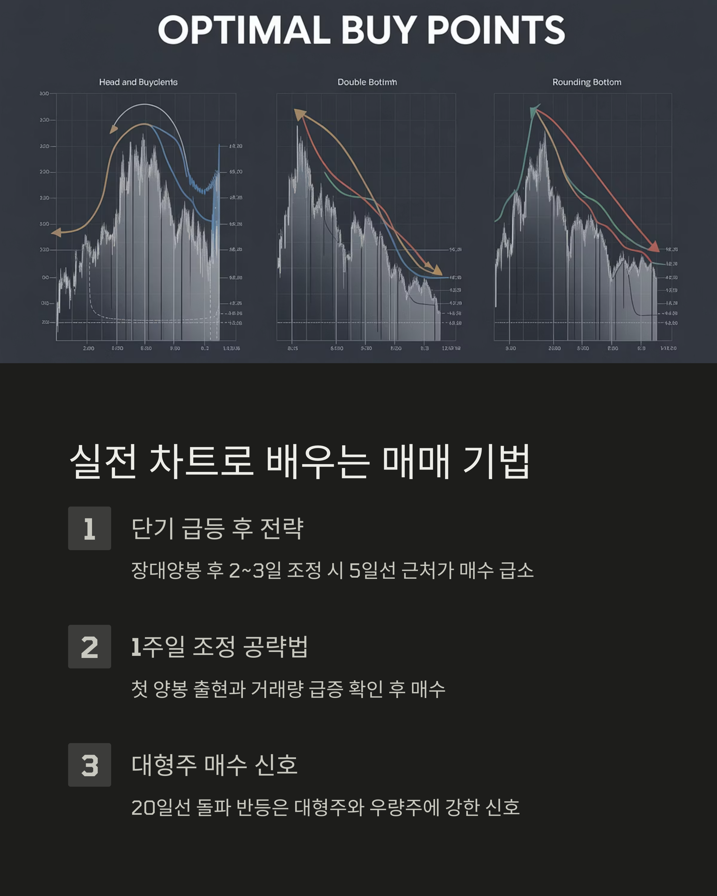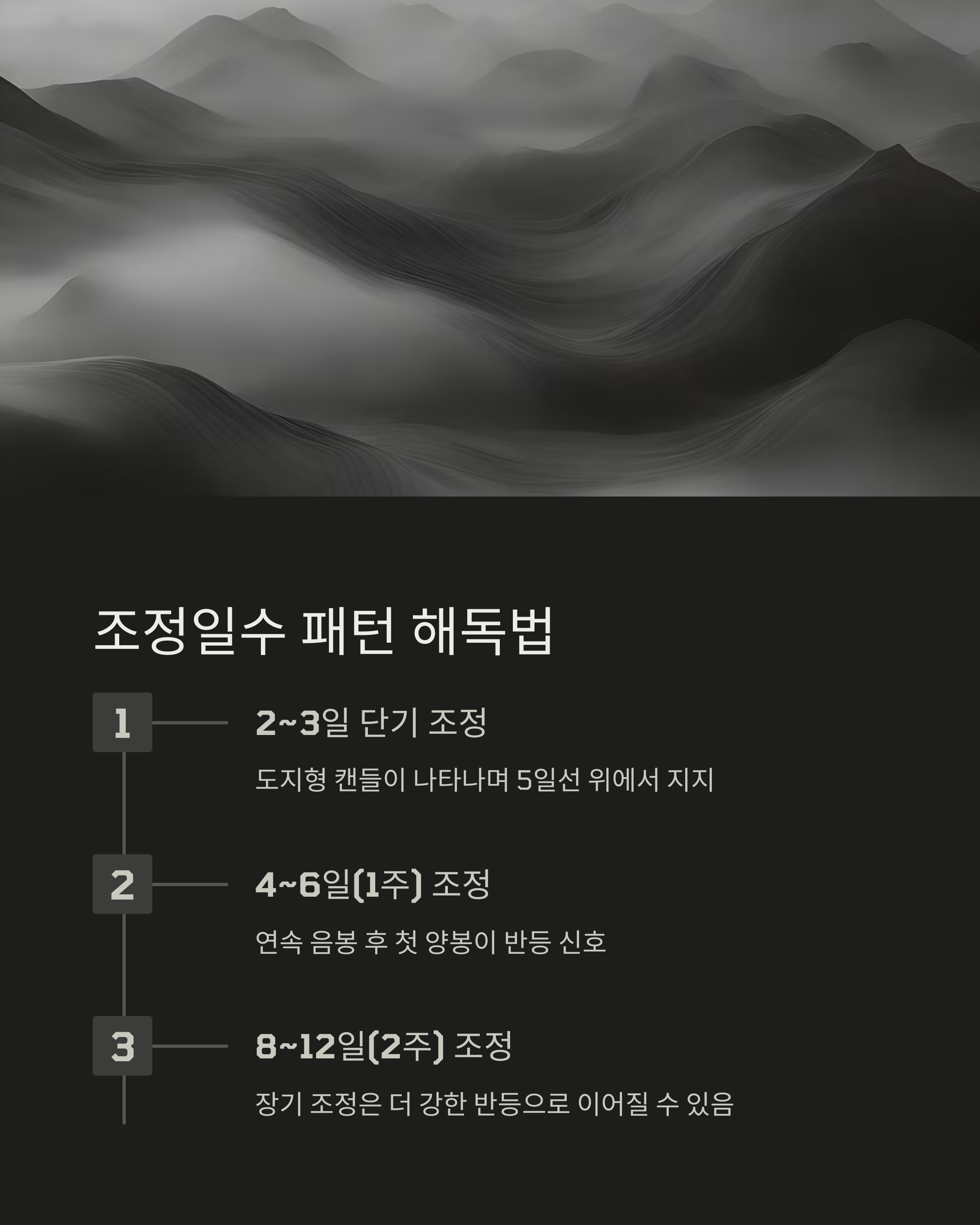 - 4~6일(1주) 조정: 음봉 연속 후 첫 양봉이 반등 신호