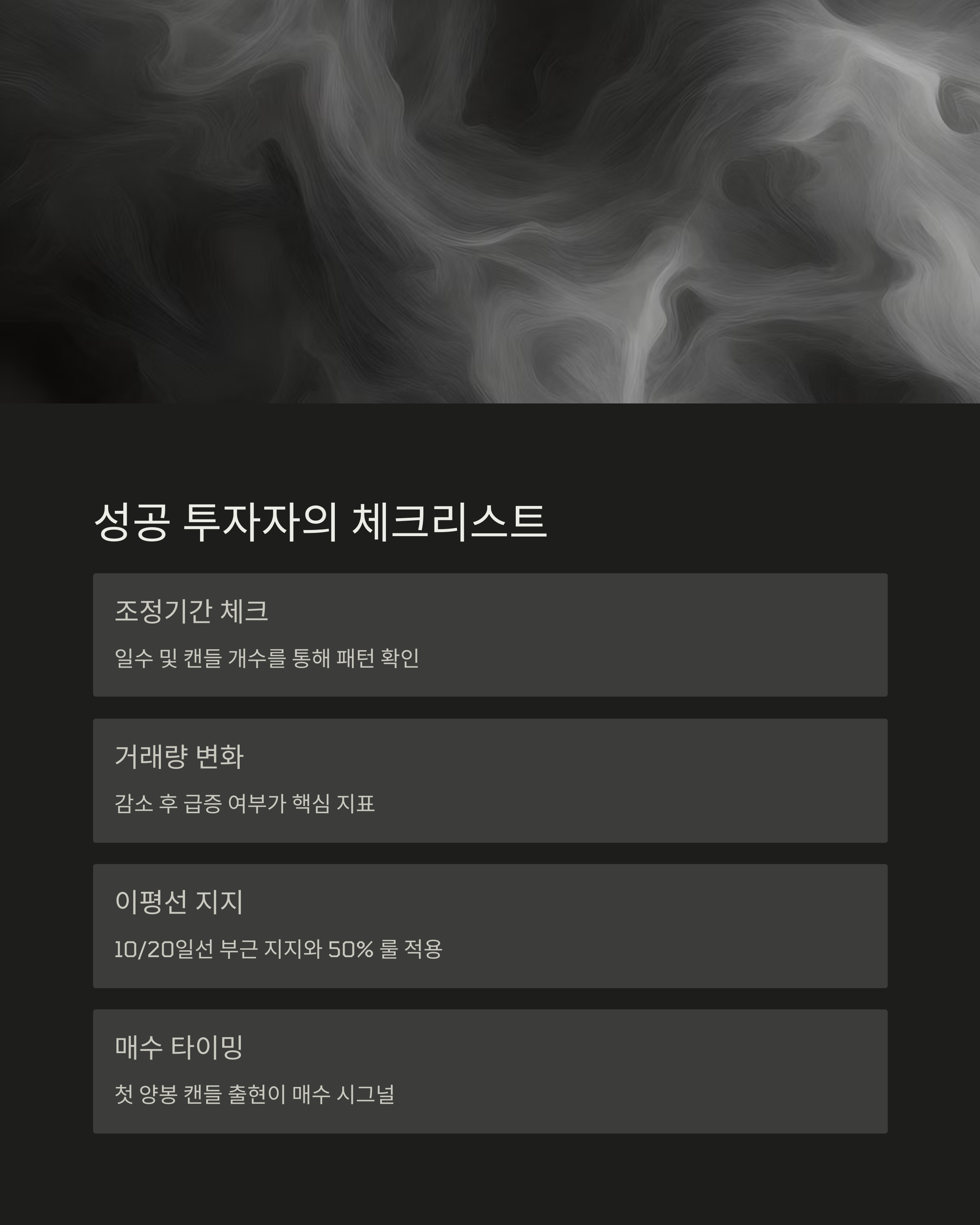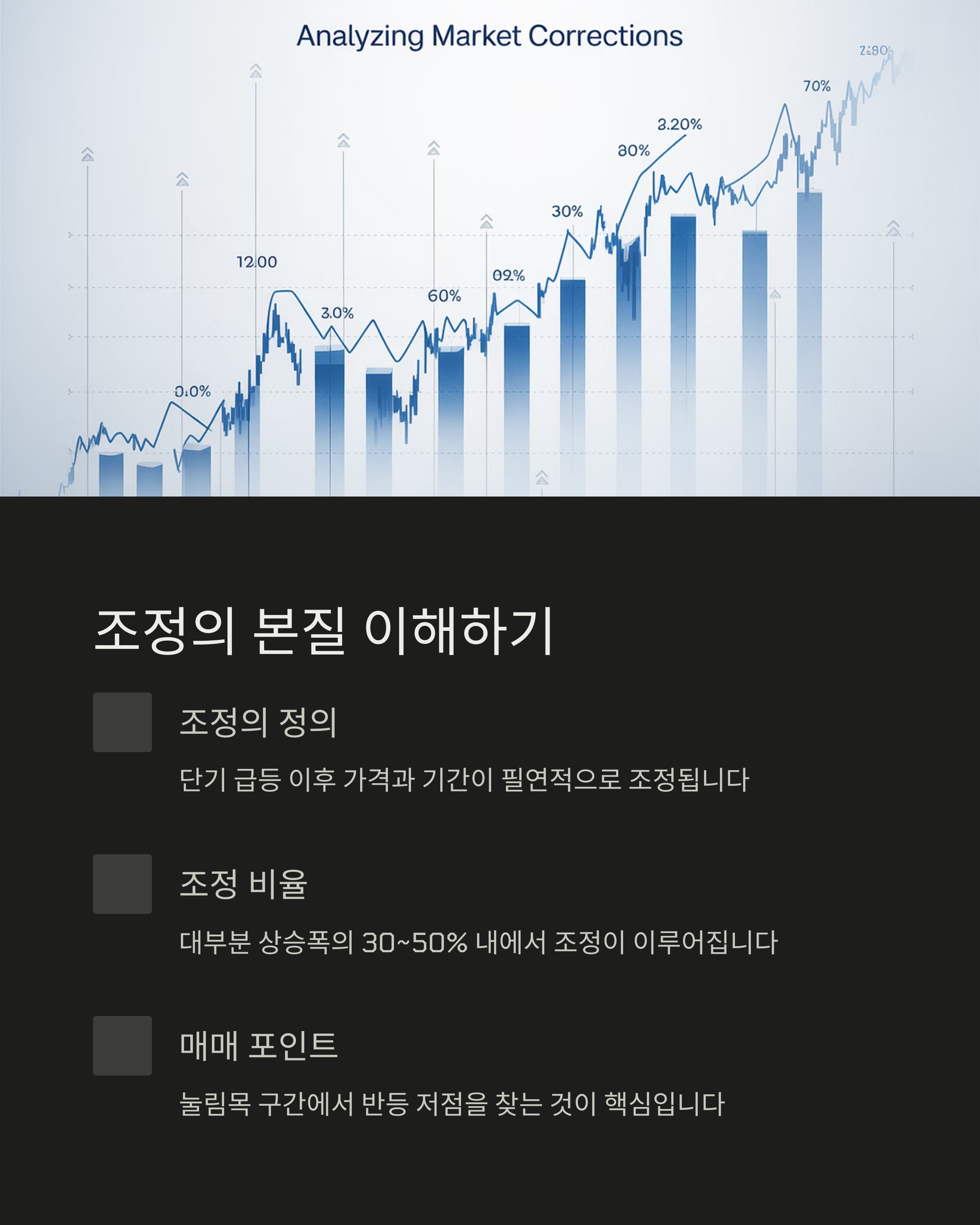 - 50% 룰: 조정폭이 상승폭의 50% 이내면 재상승 기대