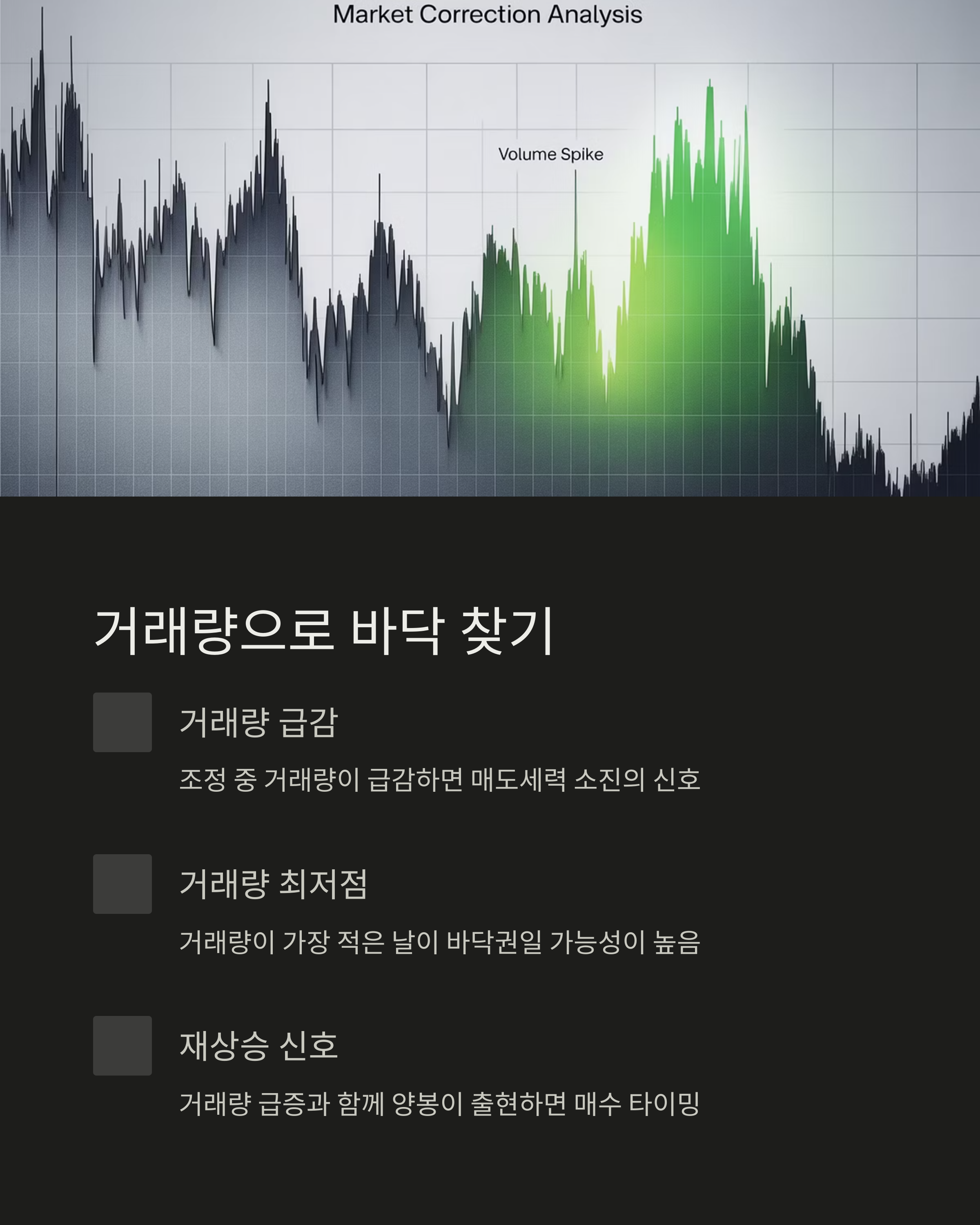 - 재상승 신호: 거래량 급증+양봉 출현
