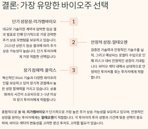 종합적으로 볼 때, 리가켐바이오가 단기적으로 가장 높은 주가 상승 가능성을 보유하고 있으며, 안정적인 성장을 원하는 투자자에게는 알테오젠이 적합합니다. 각 투자자의 투자 성향과 기간에 맞춘 선택이 중요하며, 바이오 섹터의 변동성을 고려한 분산 투자도 고려할 필요가 있습니다.