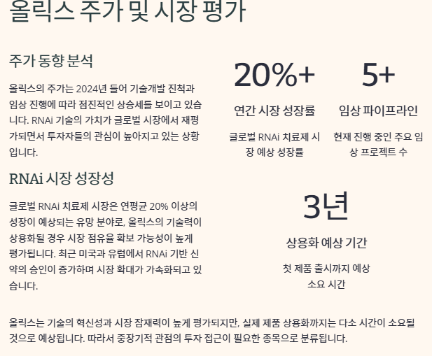 글로벌 RNAi 치료제 시장은 연평균 20% 이상의 성장이 예상되는 유망 분야로, 올릭스의 기술력이 상용화될 경우 시장 점유율 확보 가능성이 높게 평가됩니다. 최근 미국과 유럽에서 RNAi 기반 신약의 승인이 증가하며 시장 확대가 가속화되고 있습니다.