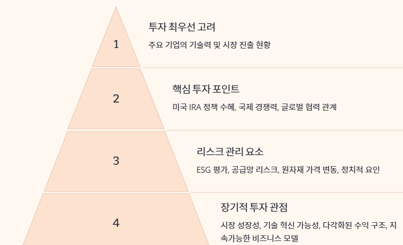 - 기술 경쟁력: 배터리 에너지 밀도, 수명, 안전성 등 핵심 기술 보유 여부