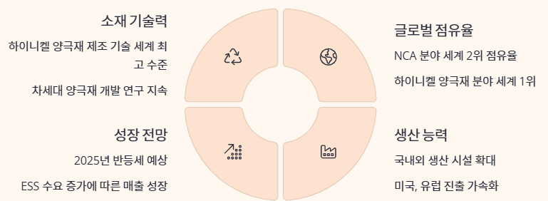 에코프로비엠은 세계 1위의 하이니켈 양극재 제조 기업으로, 특히 NCA(니켈·코발트·알루미늄) 분야에서 세계 2위의 점유율을 보유하고 있습니다. 양극재는 이차전지의 핵심 소재로, 배터리의 에너지 밀도와 성능을 결정짓는 중요한 요소입니다. 에코프로비엠의 기술력은 이차전지 산업 내에서 독보적인 위치를 차지하고 있습니다.