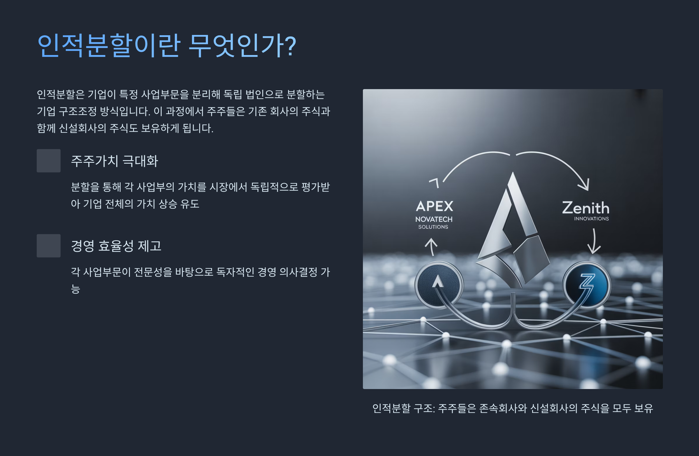 "인적분할은 단순한 구조조정이 아닌 기업가치 재발견의 기회이며, 주주와 기업 모두에게 윈윈 전략이 될 수 있습니다."