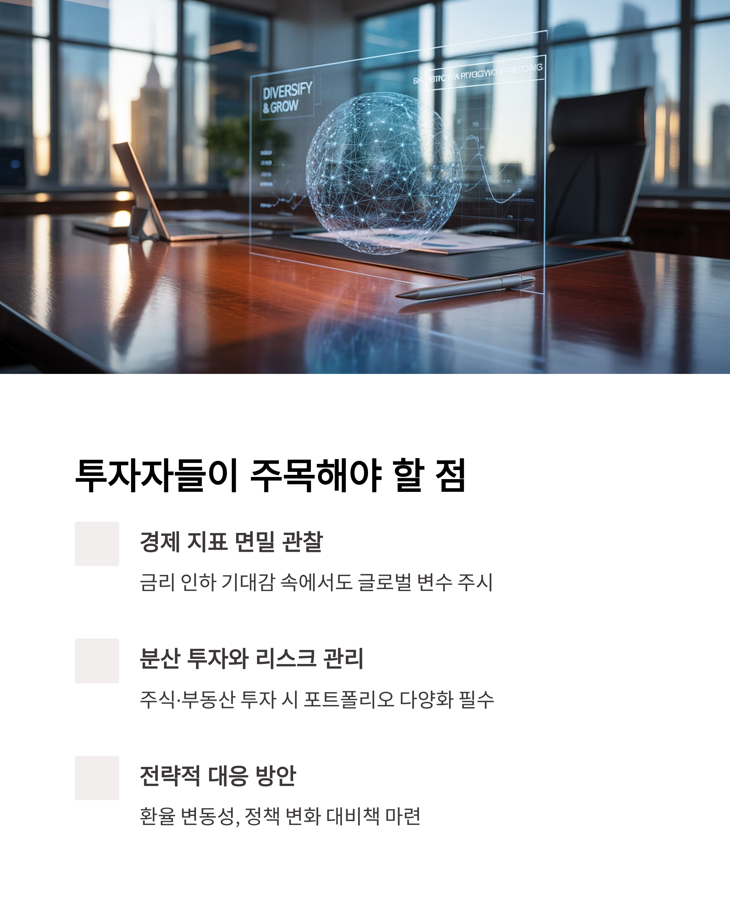 - 금리 인하 기대감 속에서도 경제 지표와 글로벌 변수 면밀 관찰 필수