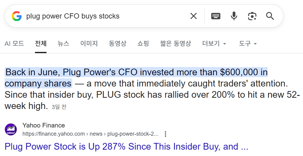 그런데, 플러그파워의 CFO는 과감하게 주식을 사 모았습니다.