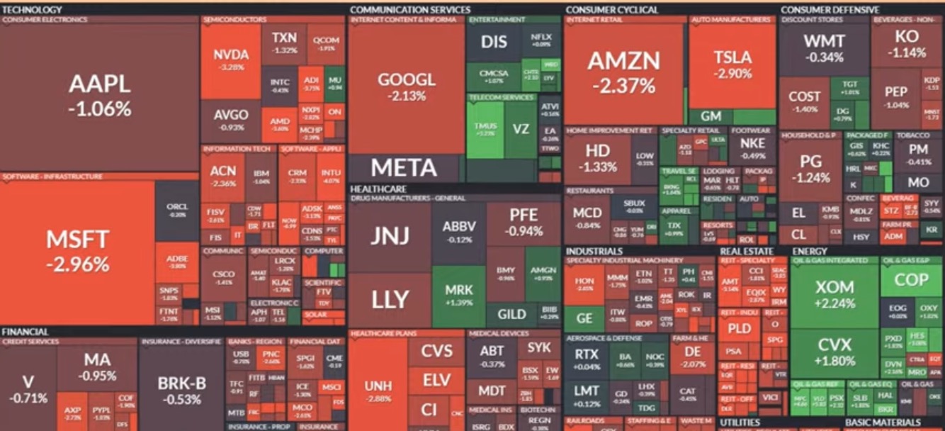 뉴욕증권거래소(NYSE)에서 다우존스30산업평균지수는 전장보다 339.69포인트(1.02%) 하락한 3만2930.08로 마감했다. 대형주 위주의 스탠더드앤드푸어스(S&P)500지수는 44.87포인트(1.16%) 떨어진 3808.10, 기술주 중심의 나스닥 종합지수는 153.52포인트(1.47%) 빠진 1만305.24로로 집계됐다.