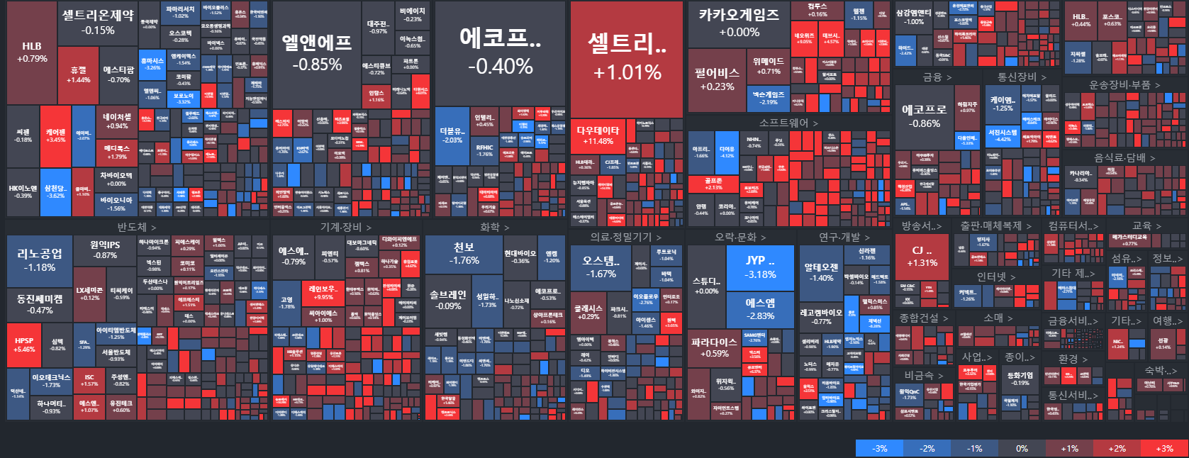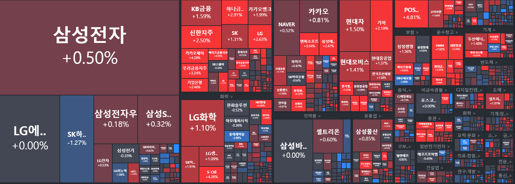 이 장표만 봐도 오늘 어느 종목이 얼마나 올랐는지.. 어떤 섹터가 많이 올랐는 지를 알수 있다.