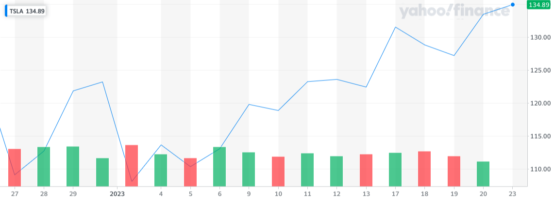 지금 테슬라 주가 흐름은 한달 동안 30% 가까운 상승률을 기록하고 있다.