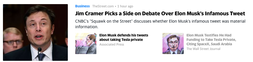 머스크는 자동차 회사를 비공개로 전환하겠다고 제안한 트윗 때문에 돈을 잃었다고 말하는 투자자들이 제기한 소송 때문에 법원에 섰다. 여기에서 그는 당당하게 "스페이스X 주식만으로도 자금이 확보되었다고 느꼈다"고 말했다. 테슬라 실적발표는 1월25일 이다.
