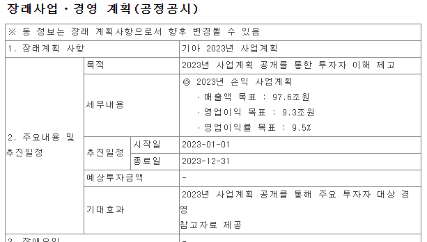 기아 주요 공시 1 : 올해 사업 목표 영업이익 9.3조원