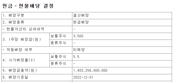 더불어 현금 배당을 5.5% 진행할 것으로 공시했다. 주당 3,500원이다.