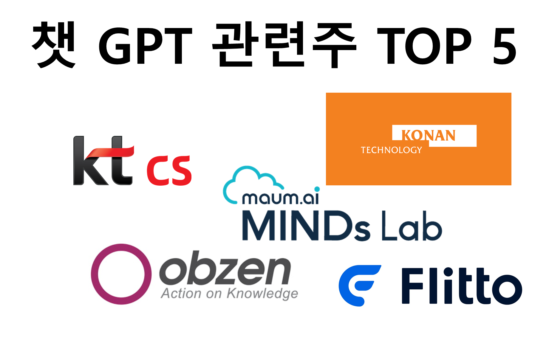계속 끓어오르는 AI 관련주 : KTcs(+29.86%), 코난테크놀로지(+29.93%), 오브젠(+30%), 마인즈랩(+21.45%), 플리토(+19.48%)