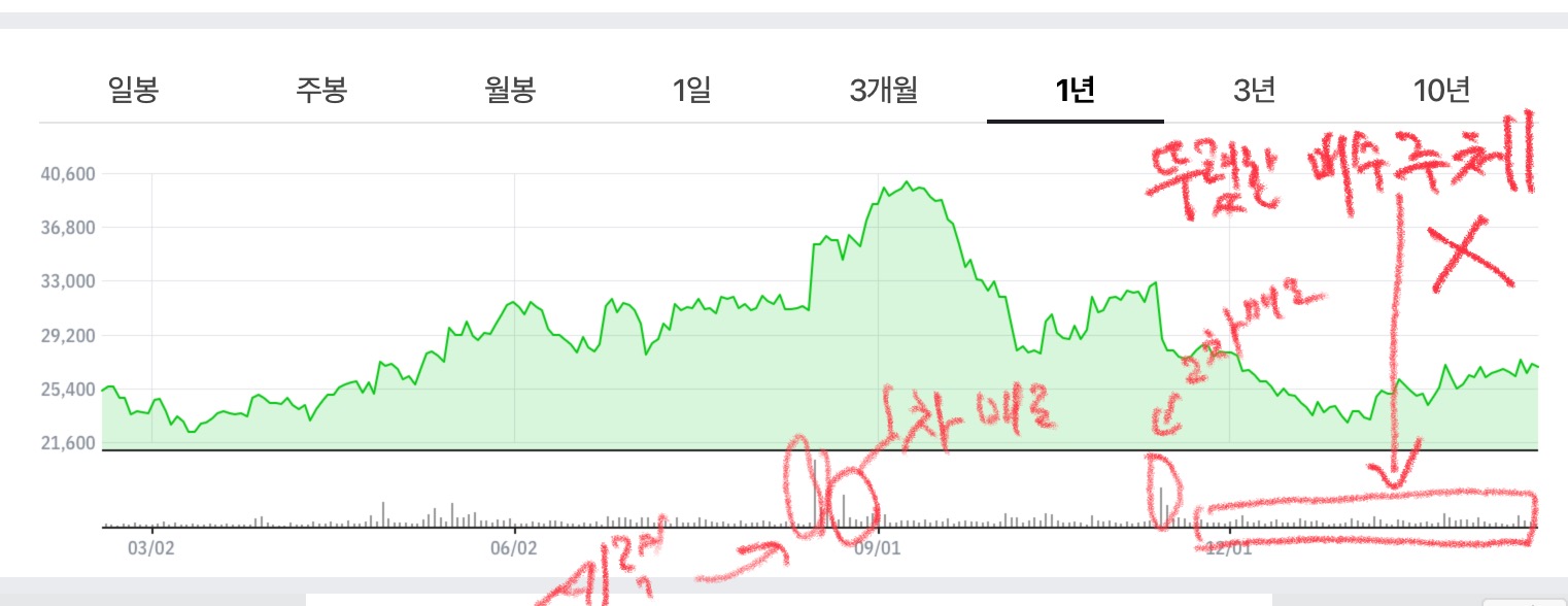 이 회사의 1년 차트를 보면 8월경 대규모 매수가 있었다. 그런데 짧은 시간에 1차 회수한 이후 12월이 시작되기 전 대량 매도하고 사라졌다. 본전도 못건졌으나 이미 15일만에 벌만큼 벌었기 때문에 금투세와 경기 문제 그리고 대주주요건 등의 이유로 대규모 매도를 11월 말에서 12월 초까지 진행한 것으로 보인다.