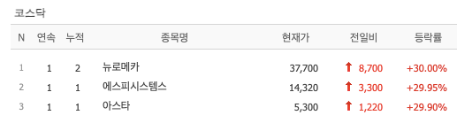 지난 주말 뉴로메카, 에시피시스템스, 아스타가 상한가를 기록했다.