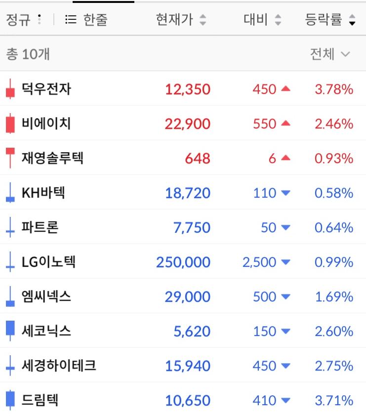 나머지 KH바텍 파트론 LG이노텍 등의 회사는 많이 싸진 느낌이다.