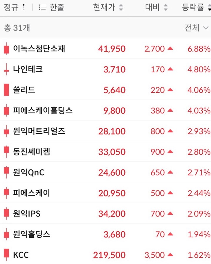 대신 2차전지용 접착제 관련주가 좀 오르고, 장비주 원익그룹주가 올랐다.