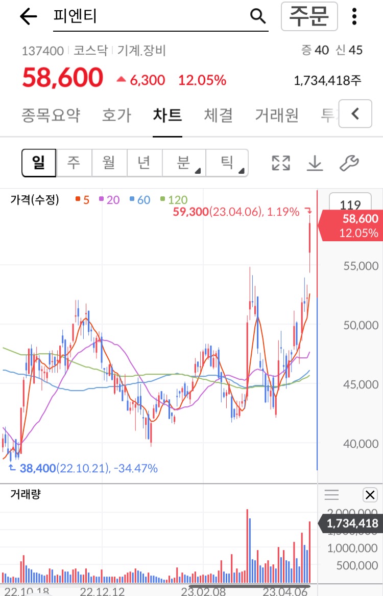 오를 종목이었던 피엔티 이차전지 장비주로 급등할 기미가 보인다.
