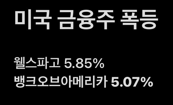 미국 웰스파고 뱡크오브아메리카 골드만삭스 그리고 JP모건 등의 주식이 많이 올랐다. 실적이 좋아서 오른 것이다.