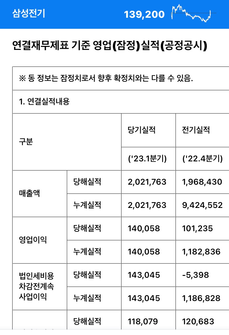 삼성전기는 1분기 S23출고로 주문 양이 늘어서 매출이 증가했다.