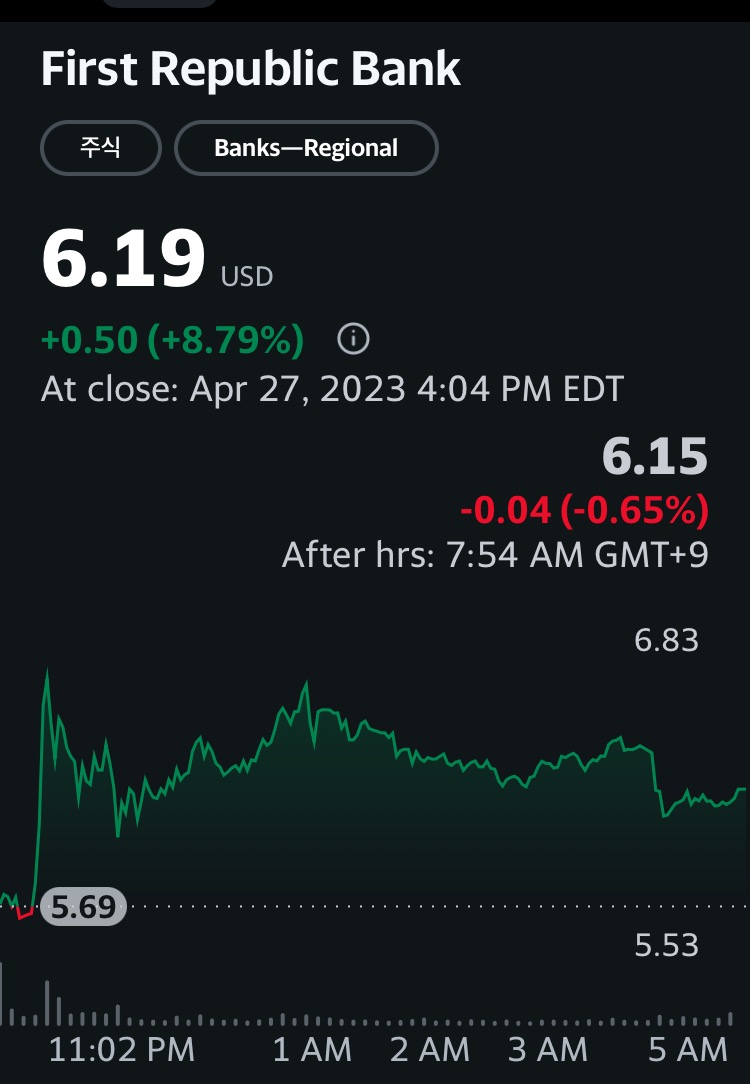 퍼스트리퍼블릭 은행을 미국 정부가 직접 지원하게 될까? 기사 하나로 8% 상승 시긴 외에서는 하락 중이다.