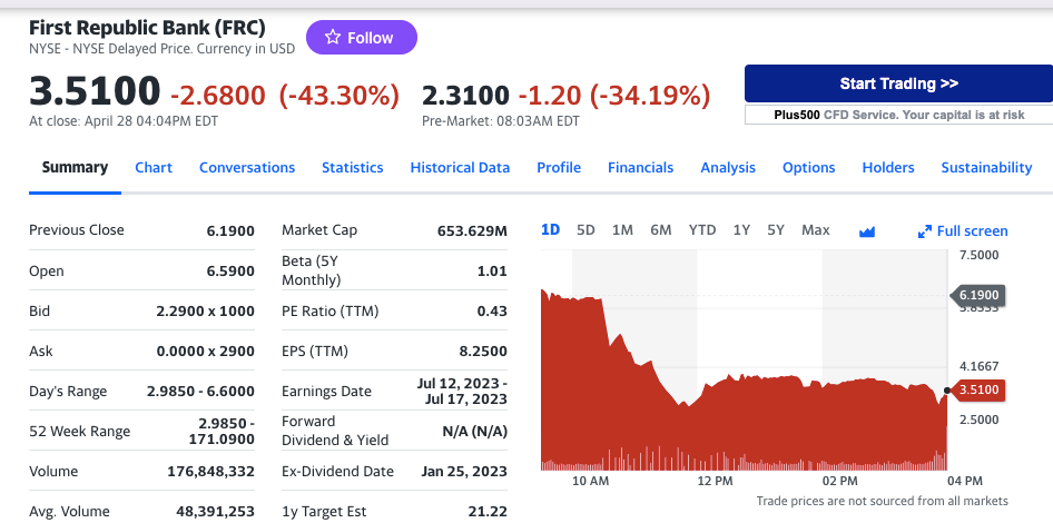 | 퍼스트리퍼블릭 은행을 미국 정부가 직접 지원하게 될까? 기사 하나로 8% 상승 시간 외에서는 하락 중 (39) | 2023.04.28 |