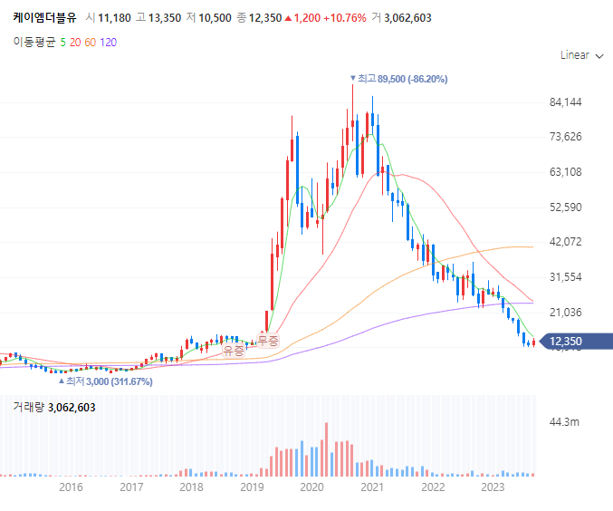 케이엠더블유는 5G 이슈가 터졌을 19년도에 엄청난 상승을 기록하여 거의 10배에 가깝게 올랐다.